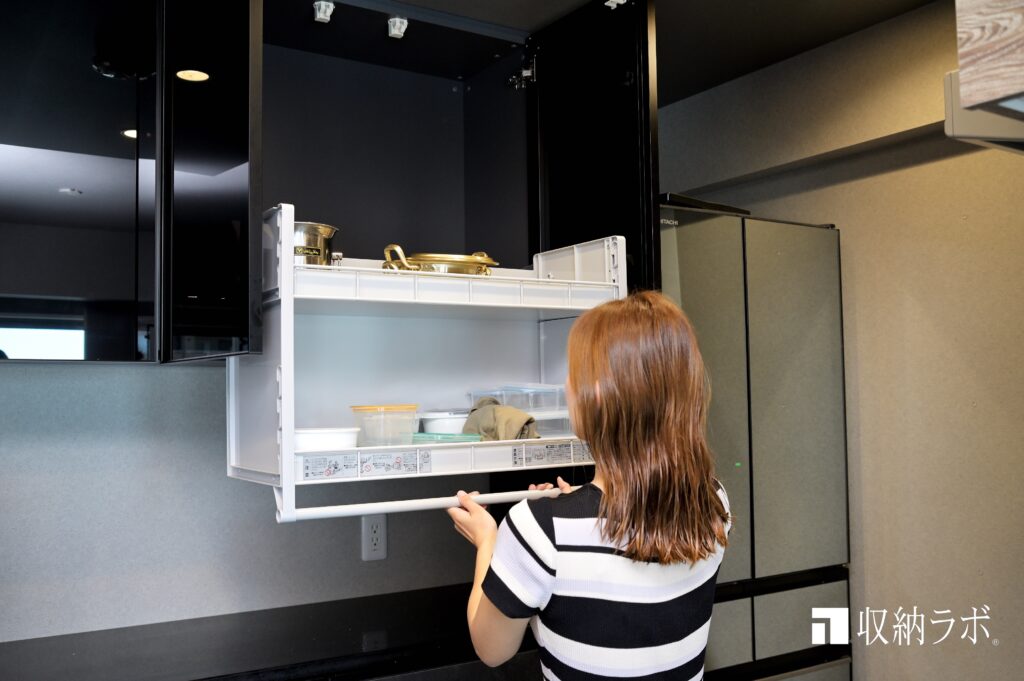 また、使う人のサイズに合わせて、吊り戸棚は昇降式(リフター)を採用。手が届かない位置にある棚は使いにくく、だんだんと使わなくなってしまいます。リフターの場合、高い位置に収納したモノが簡単に出し入れできるため、収納スペースに無駄ができません。