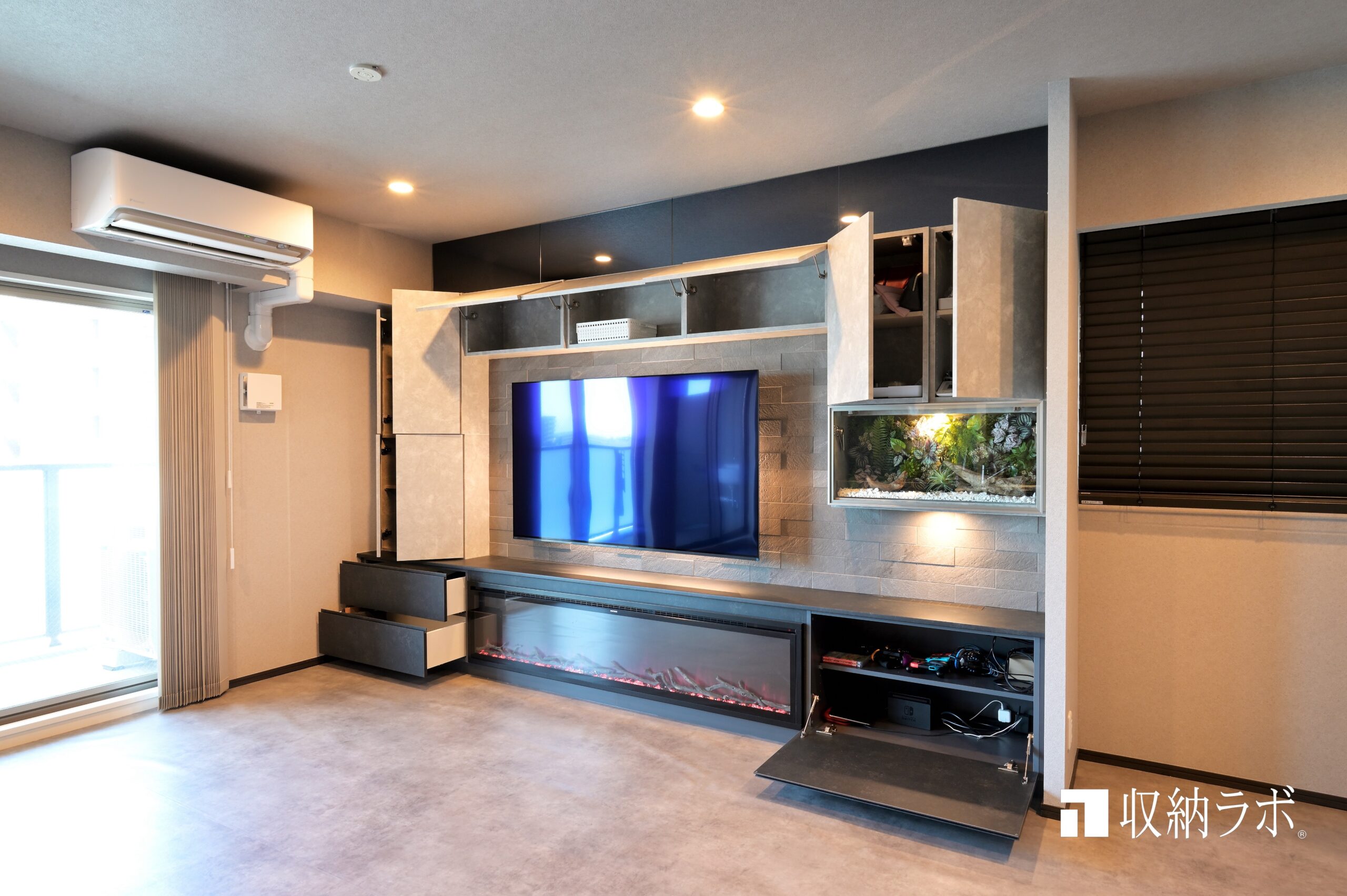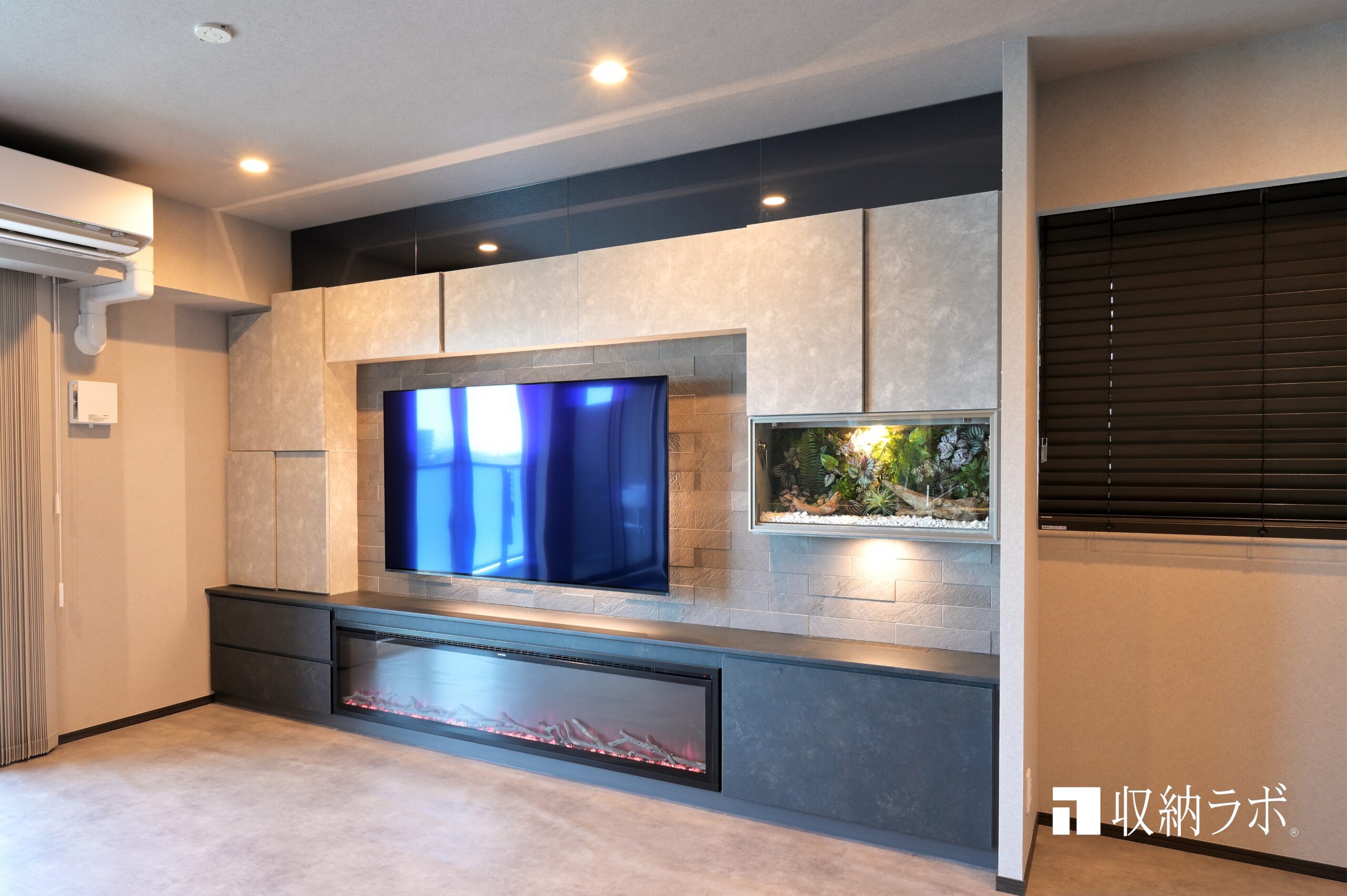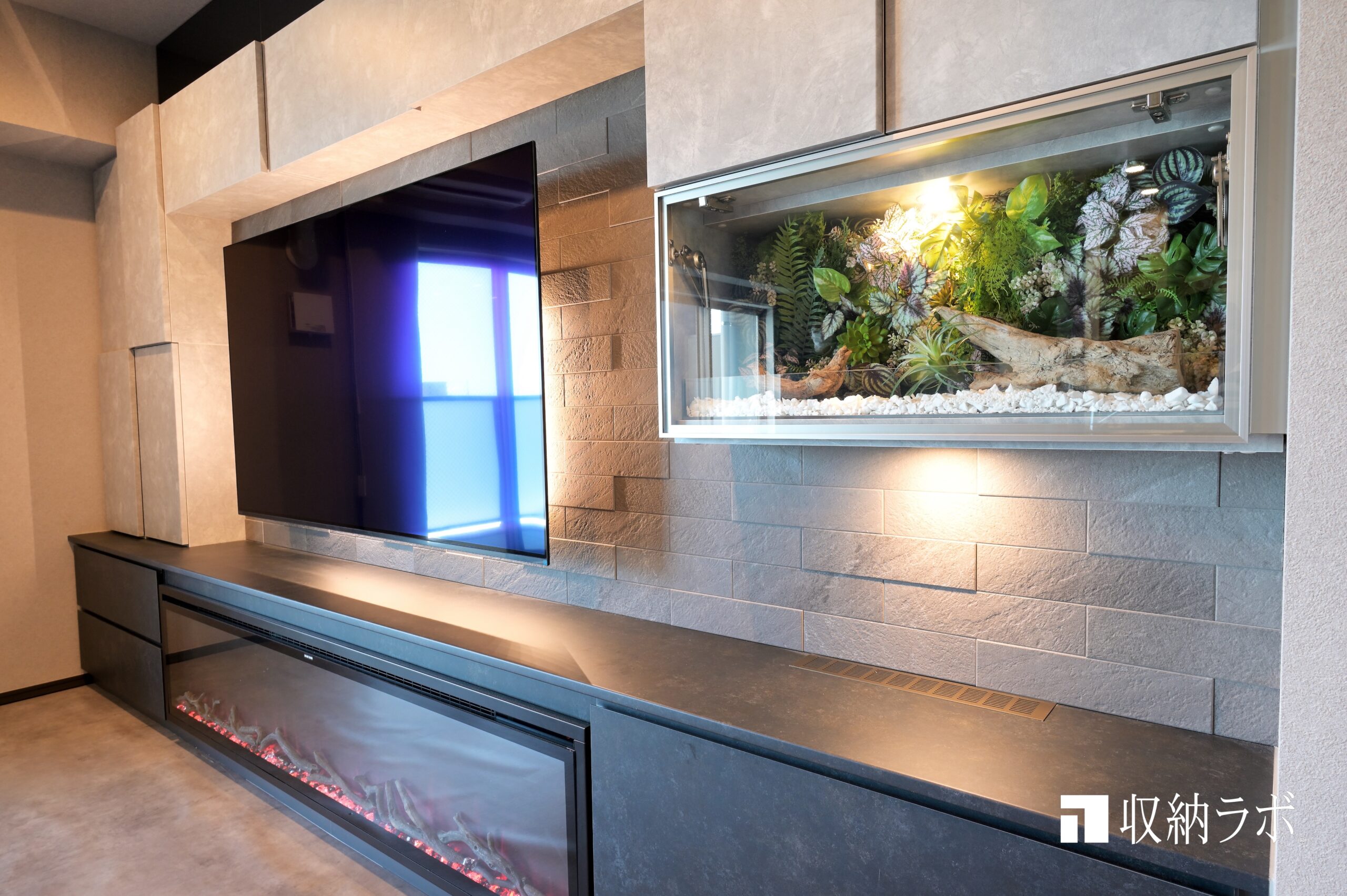 テレビ右横のアクアテラリウム風のディスプレイもお客様のこだわりのひとつ。インスタグラムで見つけたお好みのディスプレイをイメージ通りに再現することができました。水槽のなかには本物の流木などを配置し、リアリティのある世界を演出しています。