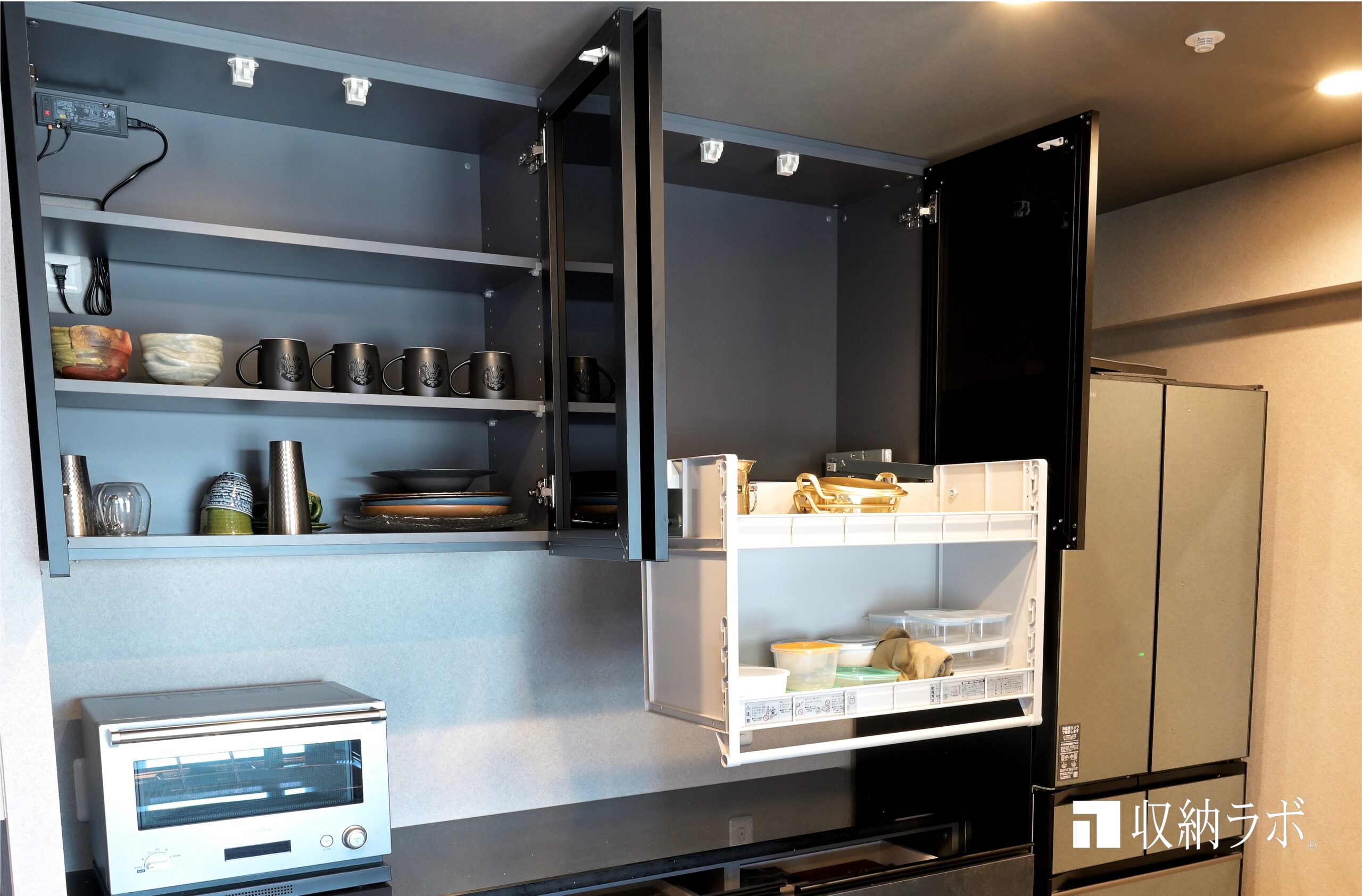 また、使う人のサイズに合わせて、吊り戸棚は昇降式(リフター)を採用。手が届かない位置にある棚は使いにくく、だんだんと使わなくなってしまいます。リフターの場合、高い位置に収納したモノが簡単に出し入れできるため、収納スペースに無駄ができません。