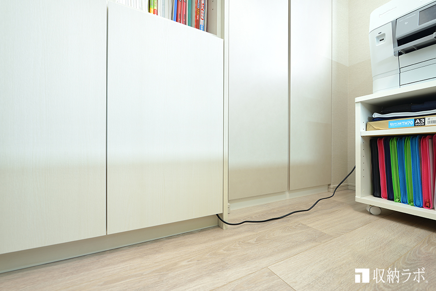 さらに上下には扉を設けることでホコリや地震対策にも配慮し、コンセントは扉を閉めたままでも使用できるよう電源コードを通せるように加工を施すなど、日常の使いやすさと安全性を両立しています。