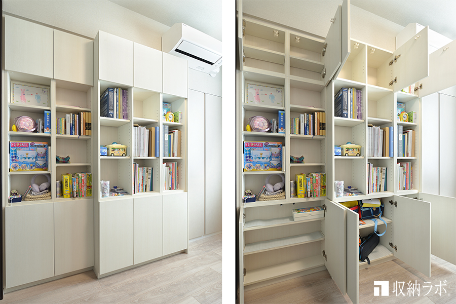 最も使いやすい中央部分は小さなお子さまでも自然と片付けができるオープン棚に。