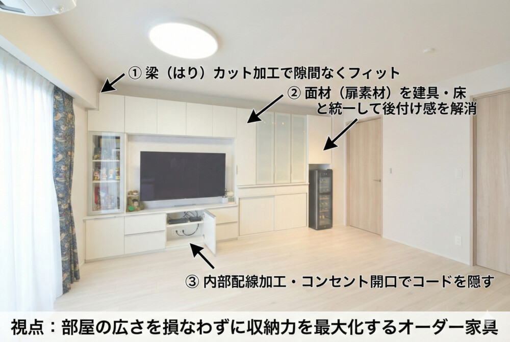 既製品では対応しきれないマンション特有の梁(はり)や柱、微妙な隙間を埋めることで、驚くほど収納力がアップします。