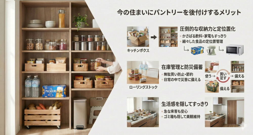 パントリーの後付けは、キッチン周りの収納不足を解消し、家事効率を高めるのに効果的です。