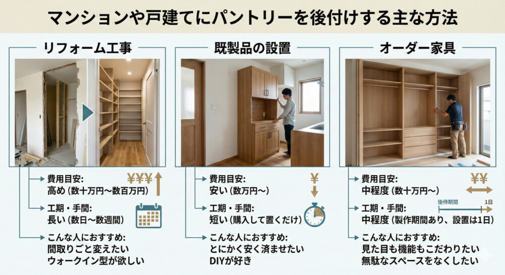 後付けパントリーを実現するには、大きく分けて「リフォーム工事」「既製品の設置」「オーダー家具」の3つのアプローチがあります。