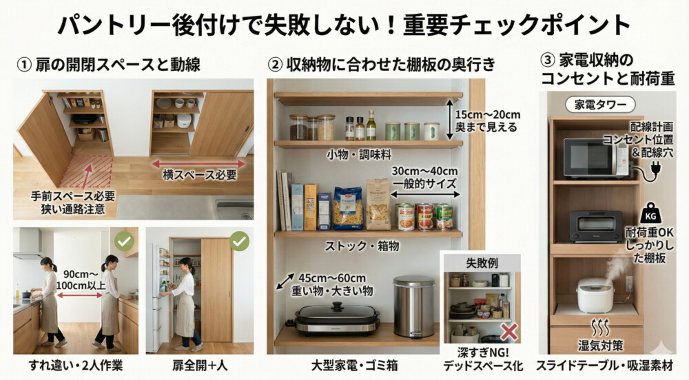 パントリーを後付けする際、収納量ばかりに気を取られて見落としがちなのが「扉の開閉スペース」と「人の動き(動線)」です。