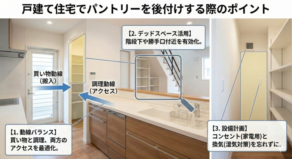パントリーを後付けする際は、「どこに空きスペースがあるか」だけでなく、「人はどう動くか」をシミュレーションすることが成功の鍵です。